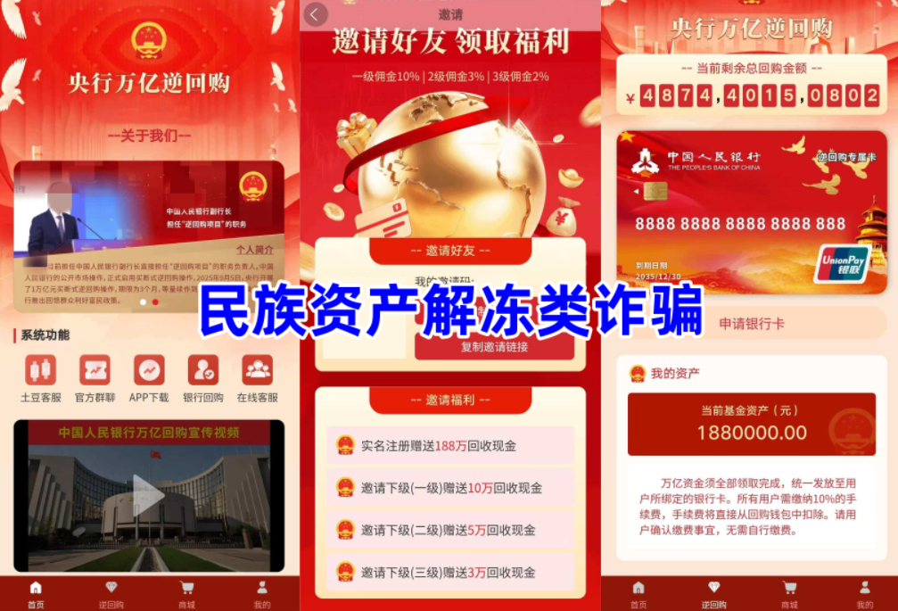 不法分子冒充“央行”的名义,制作散布涉诈APP,声称央行开展1万亿元买断式回购,实名注册即可获得188万的回购费用,发展下线可赠送回收现金,还可申请办理银行卡,涉嫌非法搜集个人信息。