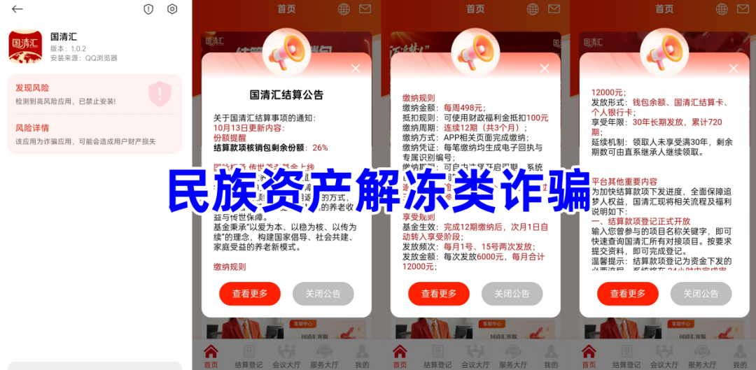 不法分子虚构“国清汇结算中心”的机构,制作散布涉诈APP,宣传“国清汇”平台是国家专项清算行动的资产托管平台。每天听课学习可领取6000元结算补贴,连续签到可领取138万元。