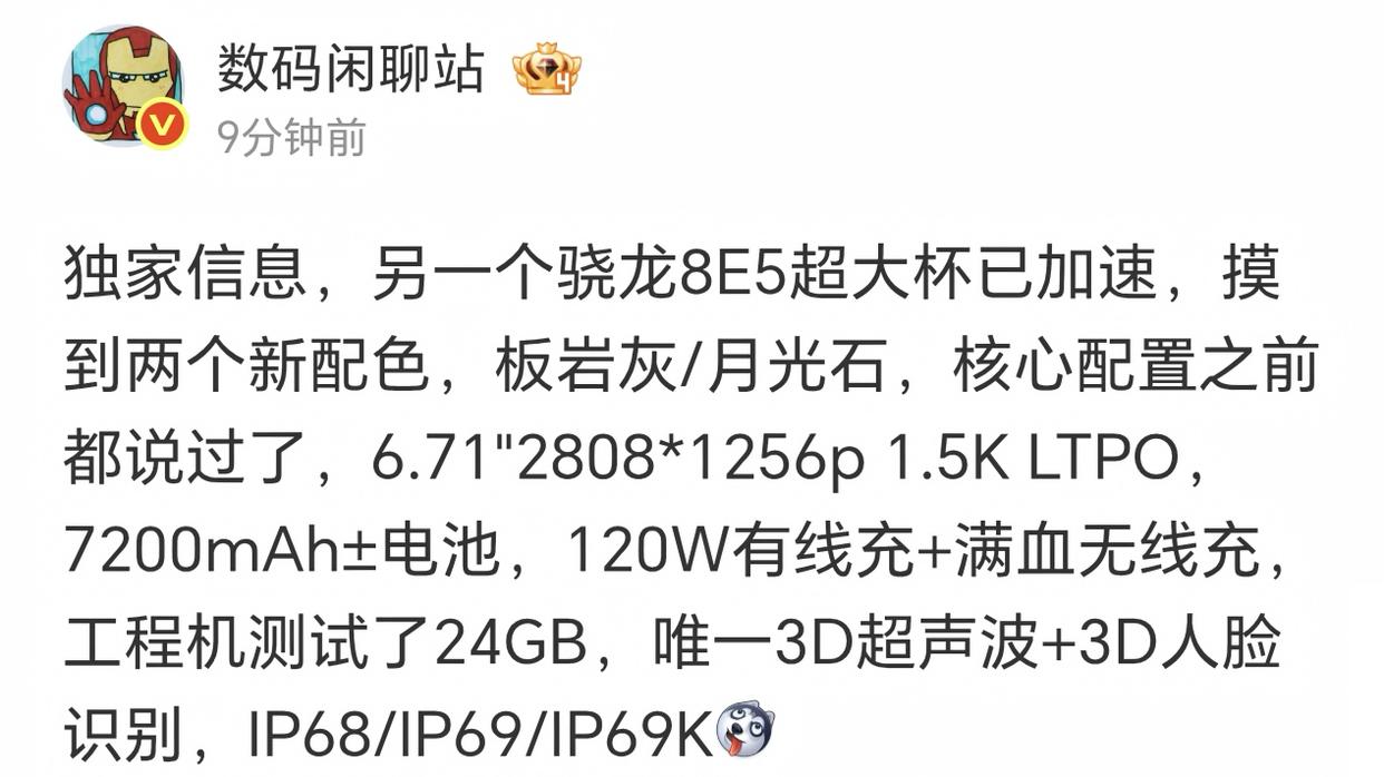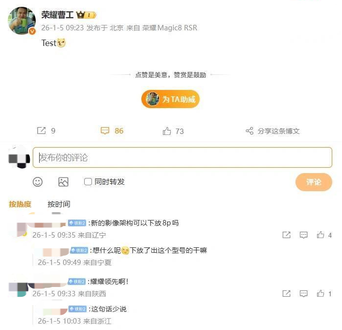 近日, @荣耀曹工 发布了一条配文“Test”的微博,本着字数越少事儿越大的原则,结合该条微博的尾巴已经更新成为了“荣耀Magic8 RSR”来看,其大概率是在暗示已经在测试这款超大杯新机了。而根据目前曝光的信息来看,该新机正在加速推进中,大概率会争取在春节前发布。