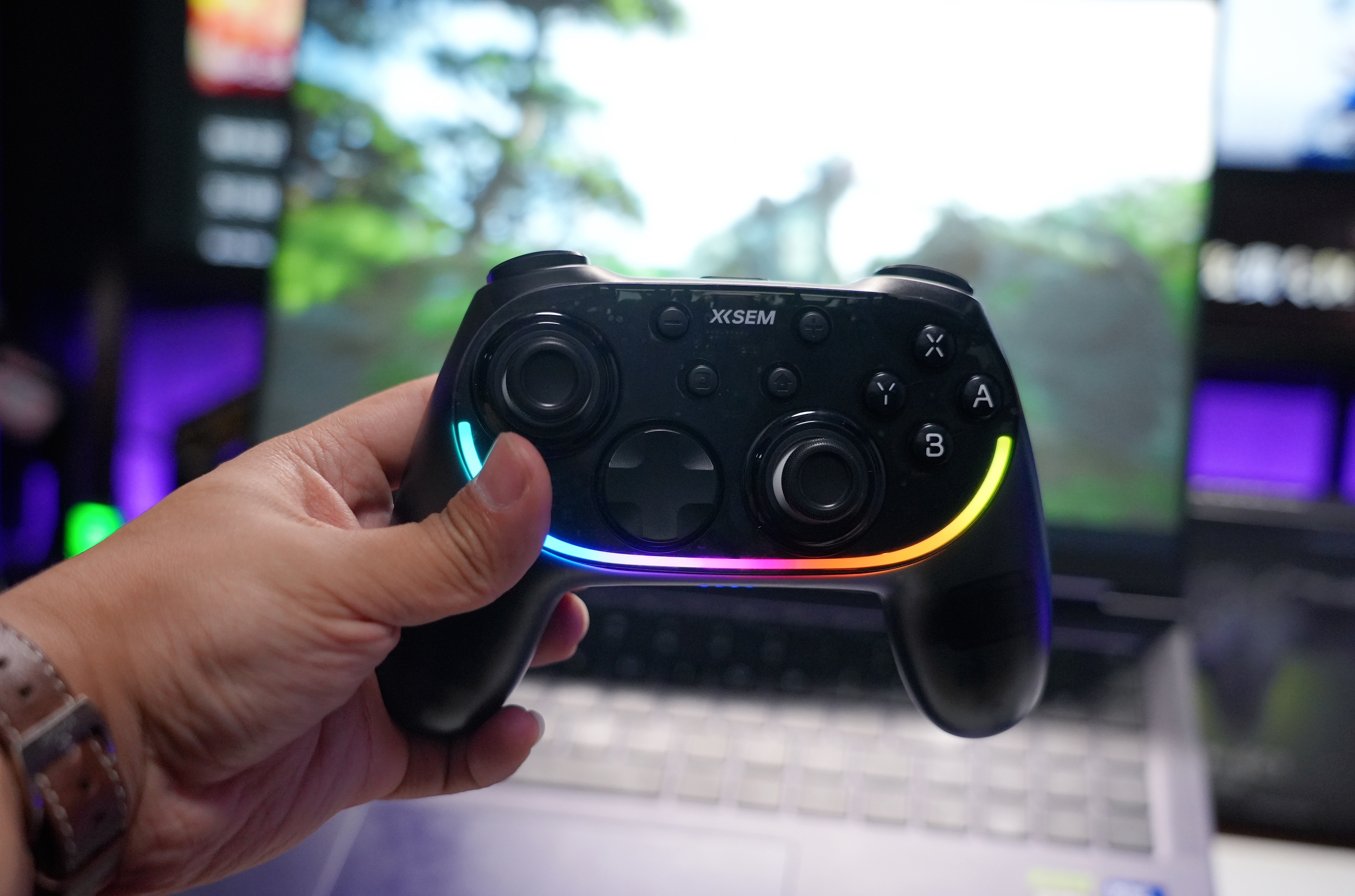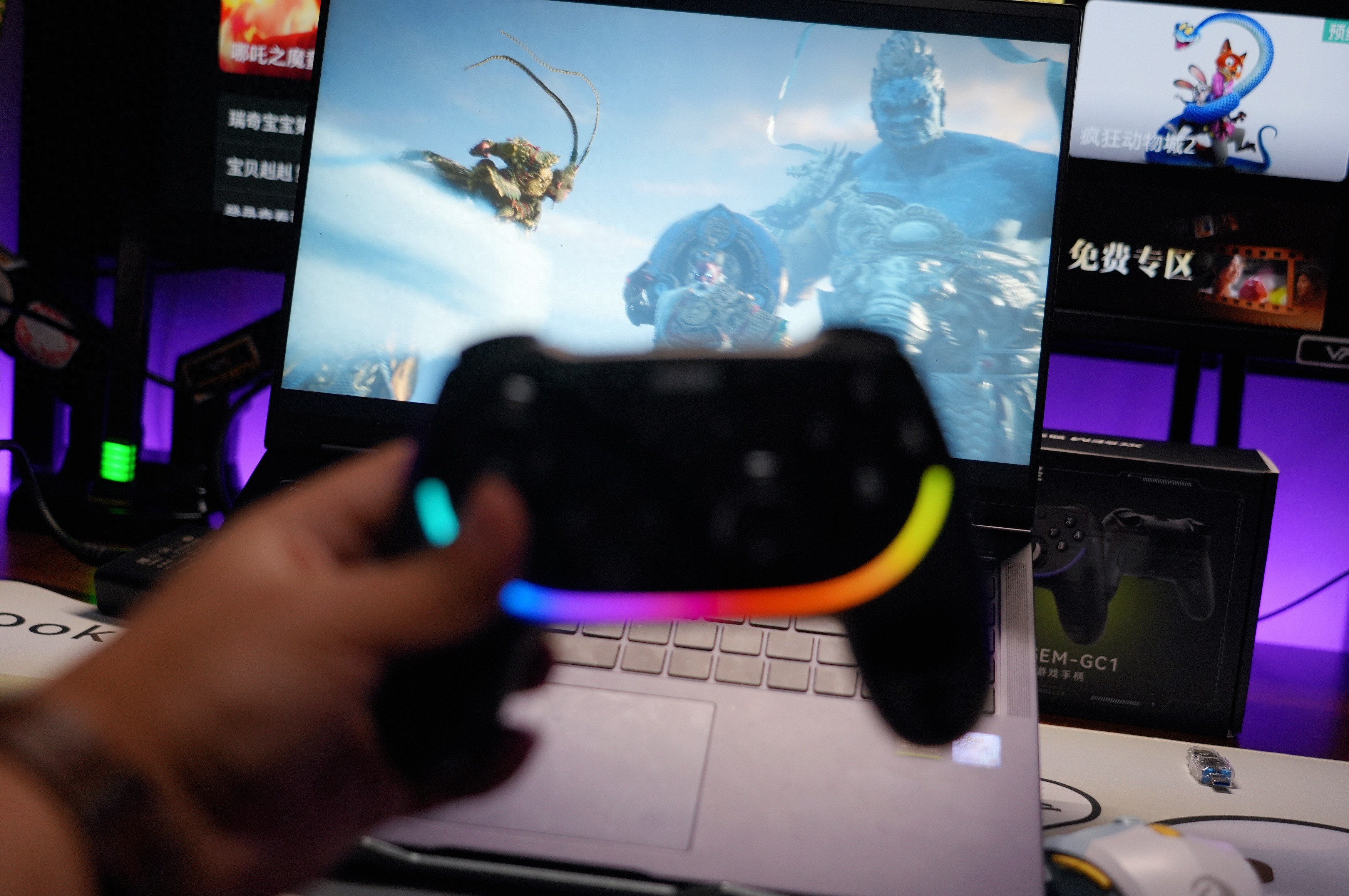 说实话,拆开包装第一反应是这不像百元手柄——半透明的机身能隐约看到里面的零件,不是那种廉价的塑料感,最惊喜的是抗指纹涂层。咱夏天手心容易出汗,之前的手柄握一会儿就黏糊糊的,得不停擦,GC1握一下午也没留印子。晚上关了灯玩,侧边的RGB灯不是那种晃眼的亮,跟着游戏节奏变颜色,玩《黑悟空神话》时氛围直接拉满,朋友来家里还问我这手柄得三百吧?