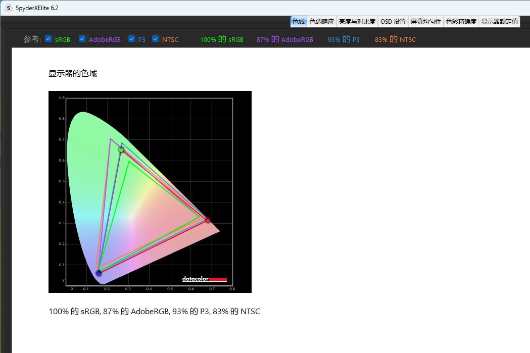 一张屏幕如果颜色不准,帧率再高也会没了心情。经过SpyderX Elite的测试,我这台27X1Q Pro 的色域为sRGB100%,DCI-P3 93%,NTSC 83%。测得数据与官方标称95%DCI-P3存在一丢丢出入,这点区别可能是个体差异或测量偏差,100%sRGB色域已经足够日常修图或剪辑需要。