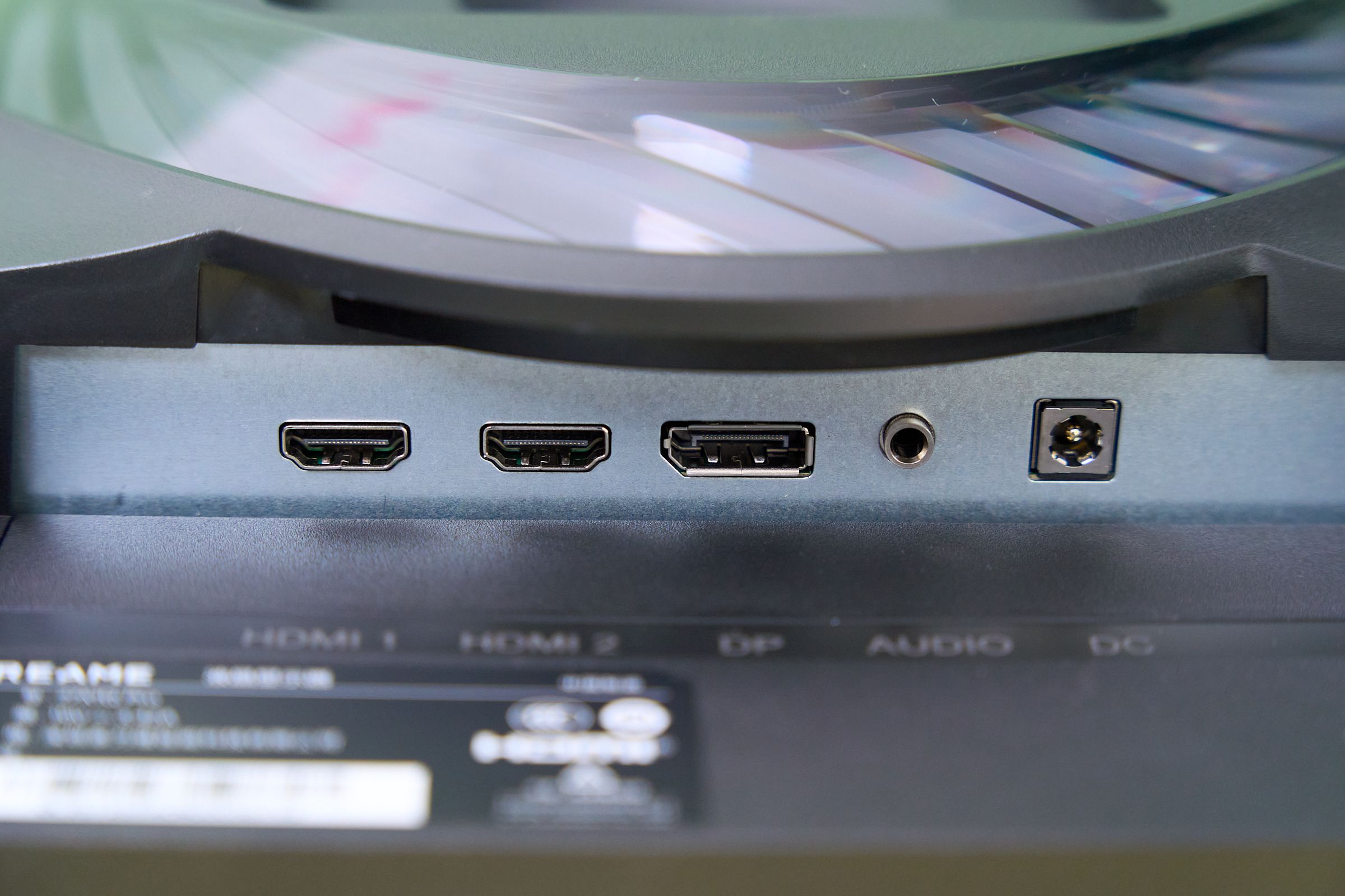 屏幕接口区位于背面下侧居中位置。从左向右依次有2个HDMI(2.0)、1个DP(1.4)、1个3.5mm音频输出和1个电源圆口。