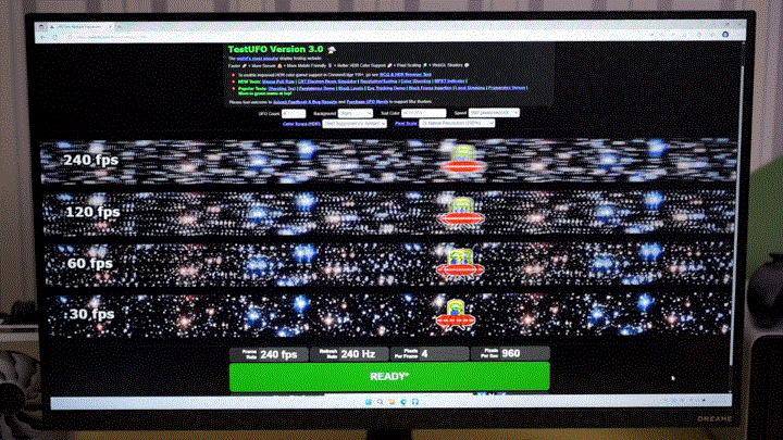 随手打开屏幕刷新率测试网站testufo.com,UFO飞行纵享丝滑,直接测得240Hz。