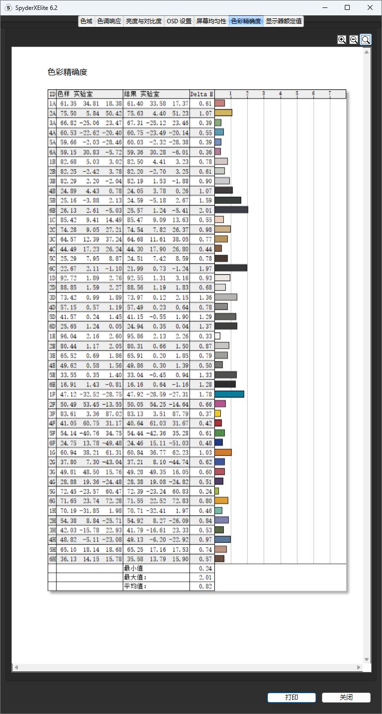 体现色彩还原准确度的Delta E值最高为2.01,最低为0.24,平均值为0.82。对于一台240Hz高刷的千元档显示器来说,这些核心指标反映其在色域覆盖和色彩还原精度方面相当强大。(如果需要这台完成校色的色彩配置文件,请在评论区留下邮箱)