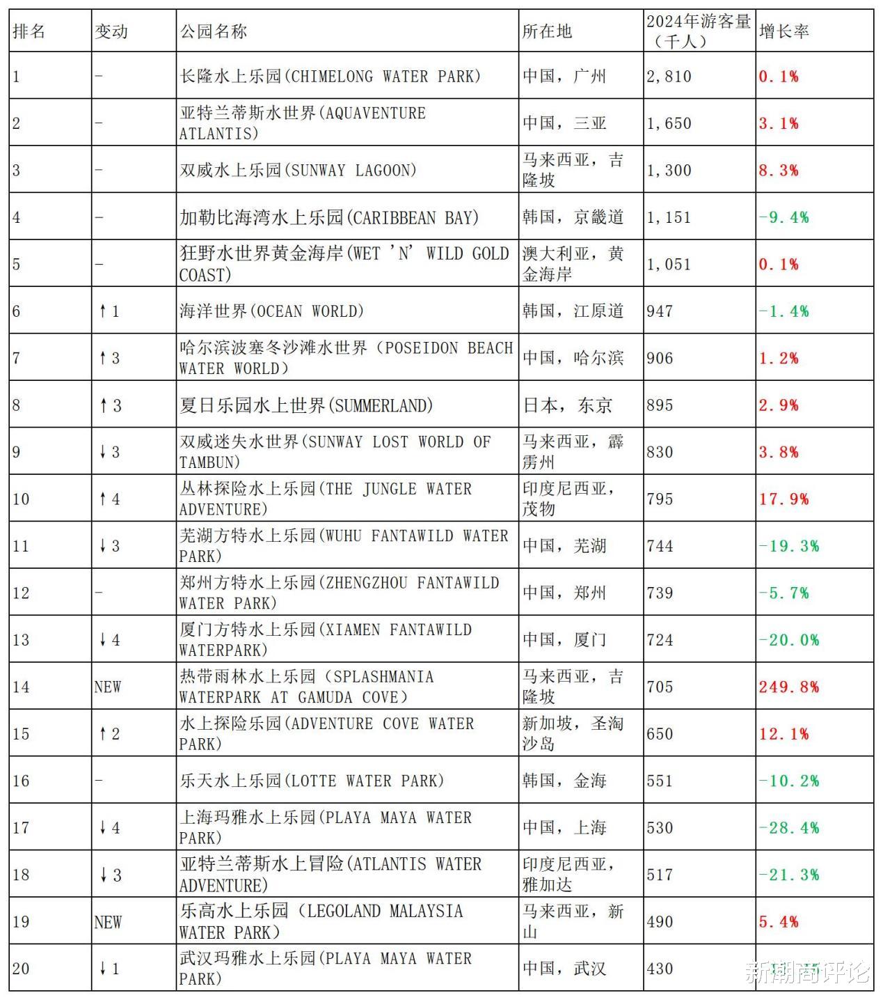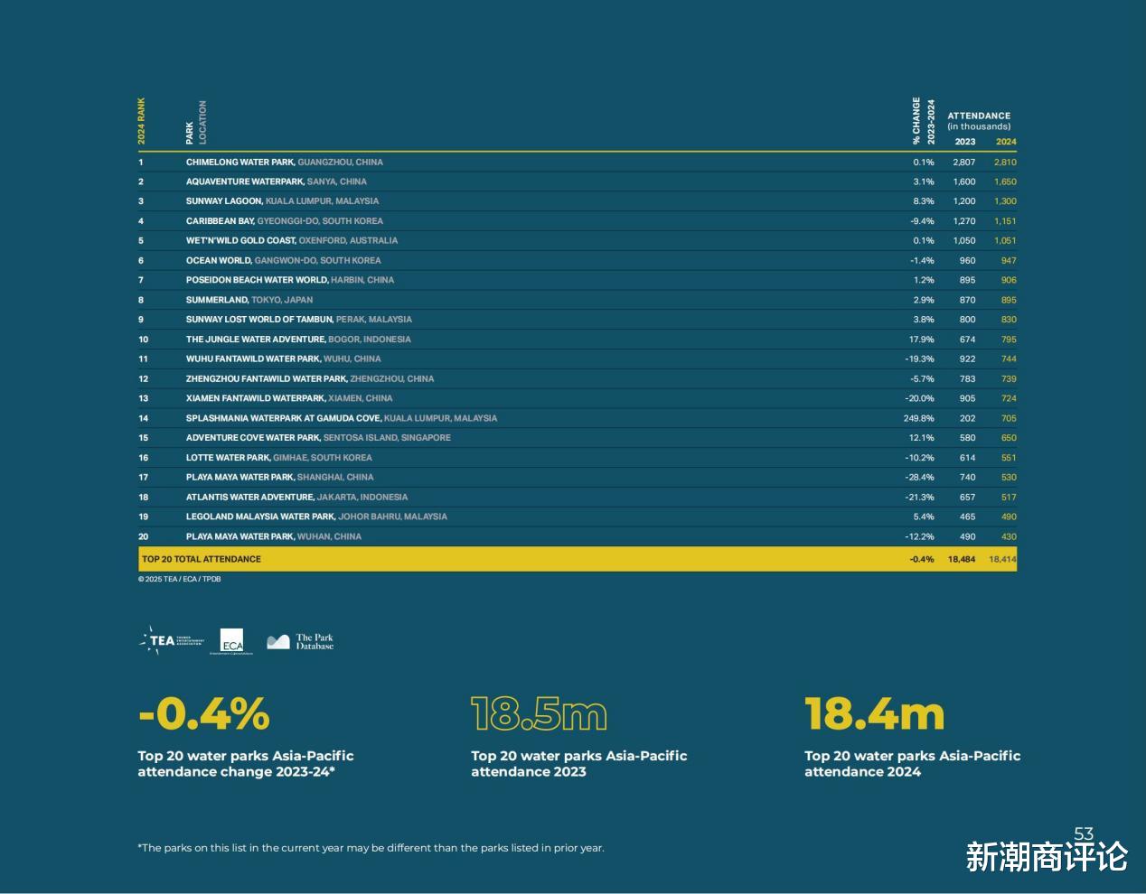 报告显示,亚太地区排名前20位的水上公园2024年游客接待量达到1841.4万人次,同比减少0.4%。从国家分布来看,中国占据8席,游客接待量为853.3万人次;紧随其后的是马来西亚4座,韩国3座,印尼2座,澳大利亚、日本、新加坡各有1座。