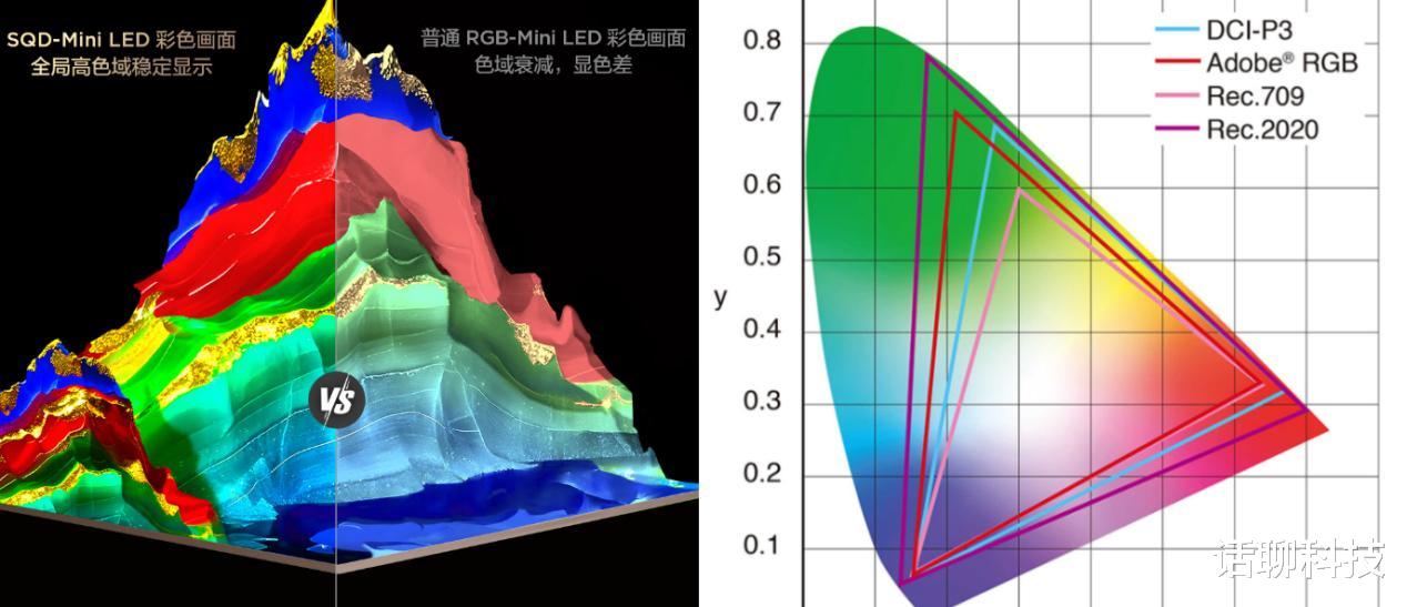 至于如何实现?背光是单色SQD-MiniLED光源全局高色域、都发白光、方向一致性好;这让其在多色彩同时显示时也会拥有比RGB-Mini LED好的色纯表现。至于100% Rec.2020覆盖到底比常见的DCI-P色域、Adobe RGB、Rec.709标准大了多少,你看标准XY马蹄形的色彩区域就知道了。