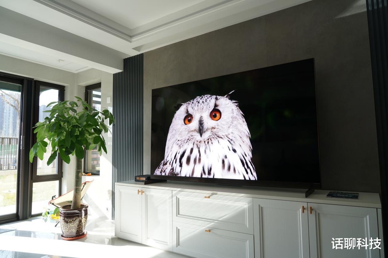 10000nits超高峰值亮度叠加内外双低反超广角超级蝶翼华曜屏,冬天大中午的太阳照射在镜面地砖上,把白色电视柜都照得煞白了,大角度看电视,画面依旧很靓丽,像真有一只金刚鹦鹉在家中。并且换个角度逆光看纯黑色夜景中的猫头鹰,也不会因为客厅阳光明媚而让电视见光死。