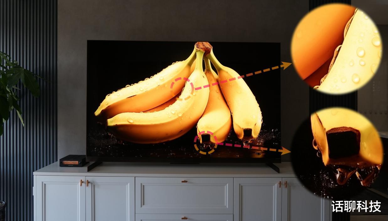 从细节来看,分区更细,画面也更细腻。比如显示黑色背景带着露珠的香蕉的画面,放大画面也不仅仅是看不到光晕,而且细微之处的明暗对比还给人一种自然立体的感觉。
