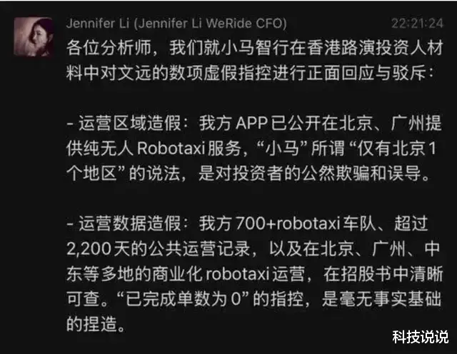 不过,双方却因“数据”打起了口水战。文远知行CFO李璇发布长文,直指小马智行在港股路演材料中对文远知行存在“运营区域造假”“运营数据造假”“技术实力存疑”等多项不实指控,并作出正面回应与驳斥。