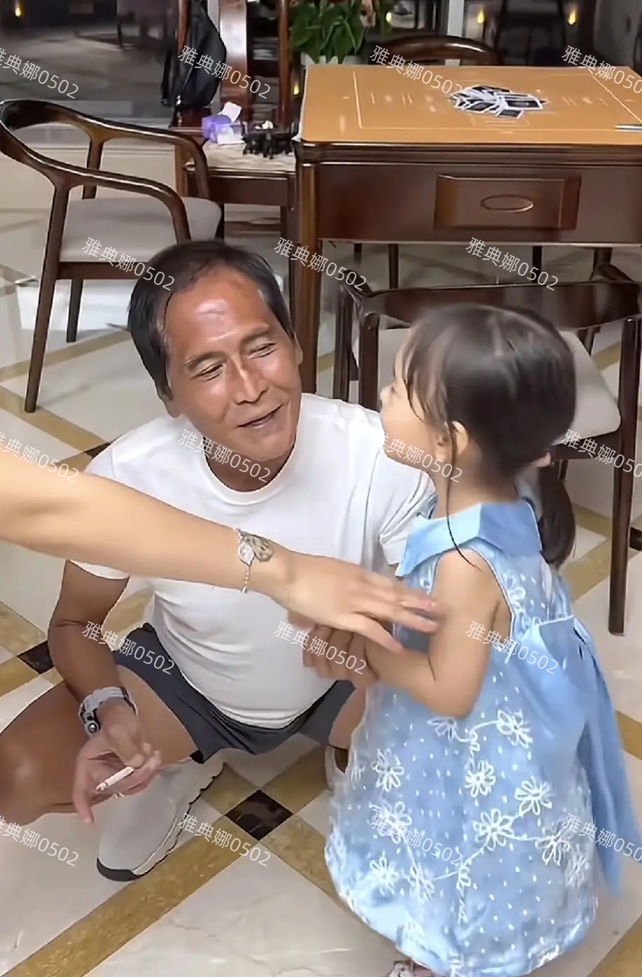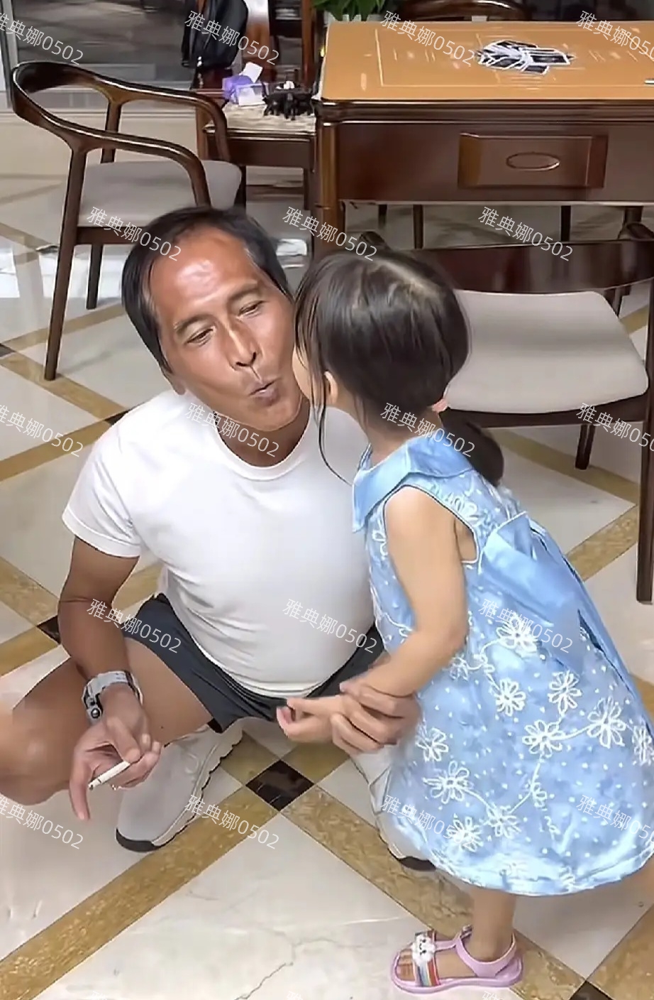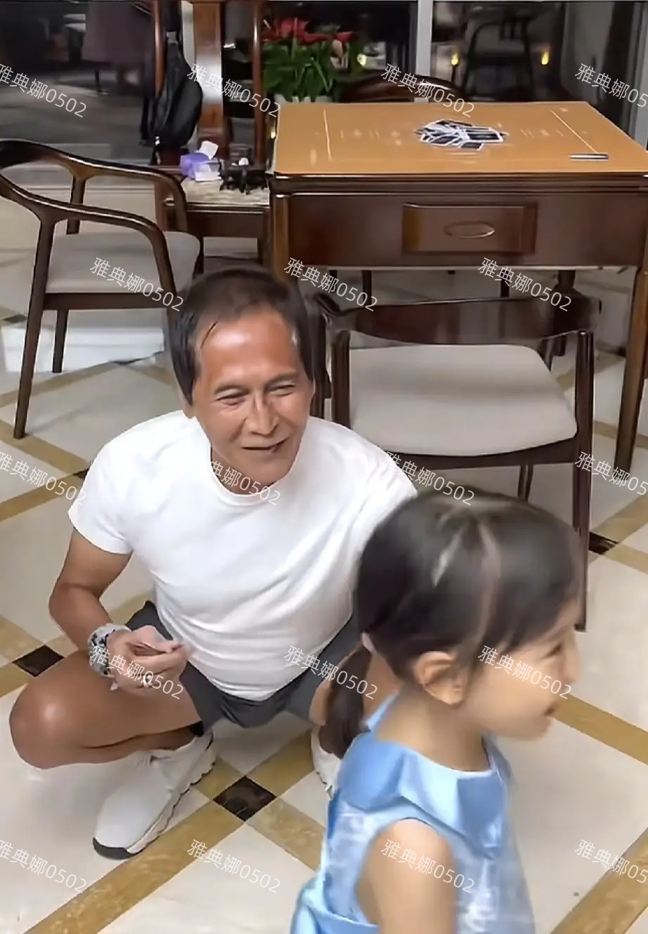 视频中齐秦跟一个穿着蓝色公主裙年龄大概四五岁的小女孩在亲密互动,看两人的年龄差,以为这个小女孩是他的孙女,其实是他的女儿。