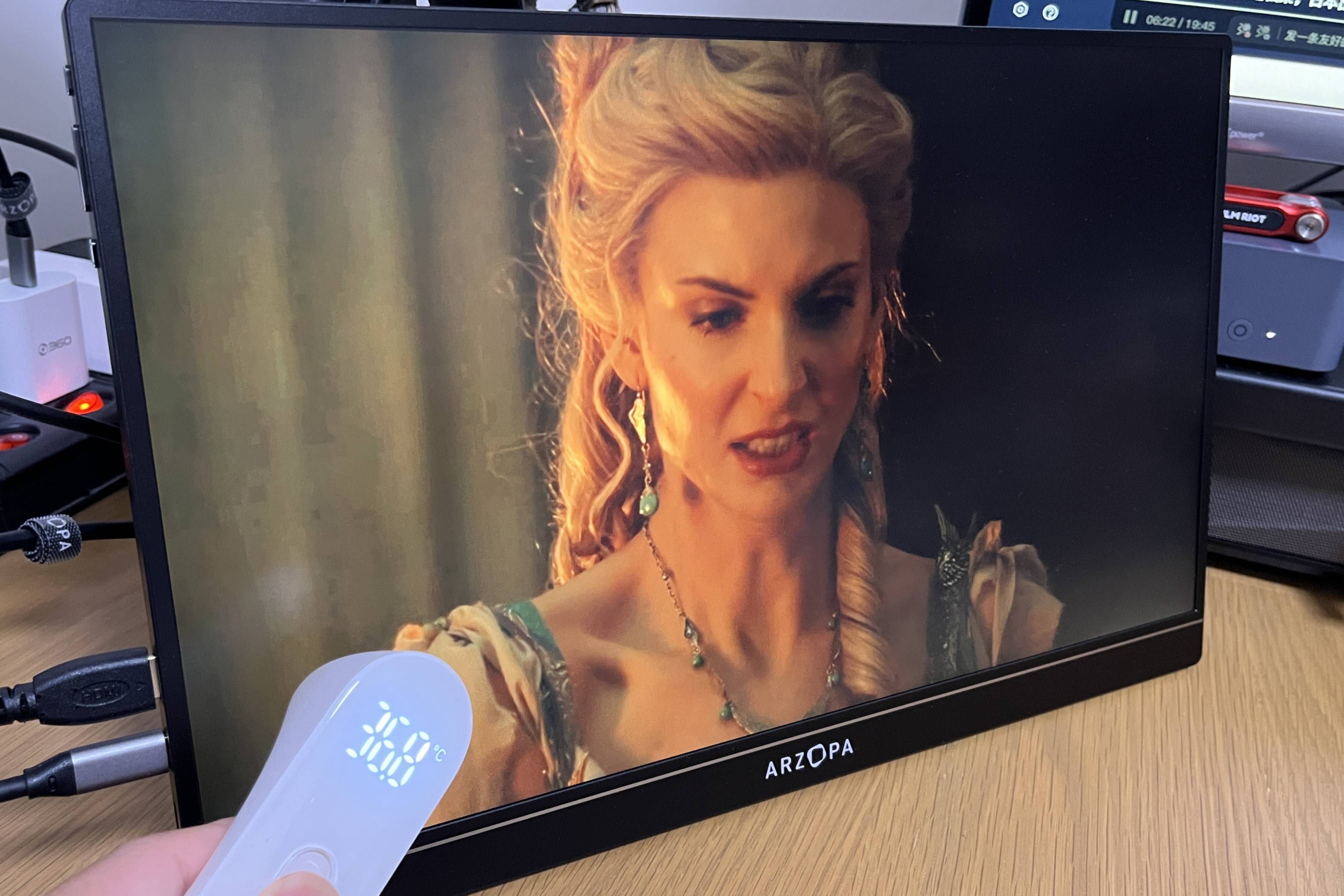 ▲播放美剧(你知道是哪部吗?)一个小时后,使用额温枪测试便携显示器表面温度不足37度,一体成型CNC铝合金专利散热框架加持,整体温度控制令人满意。