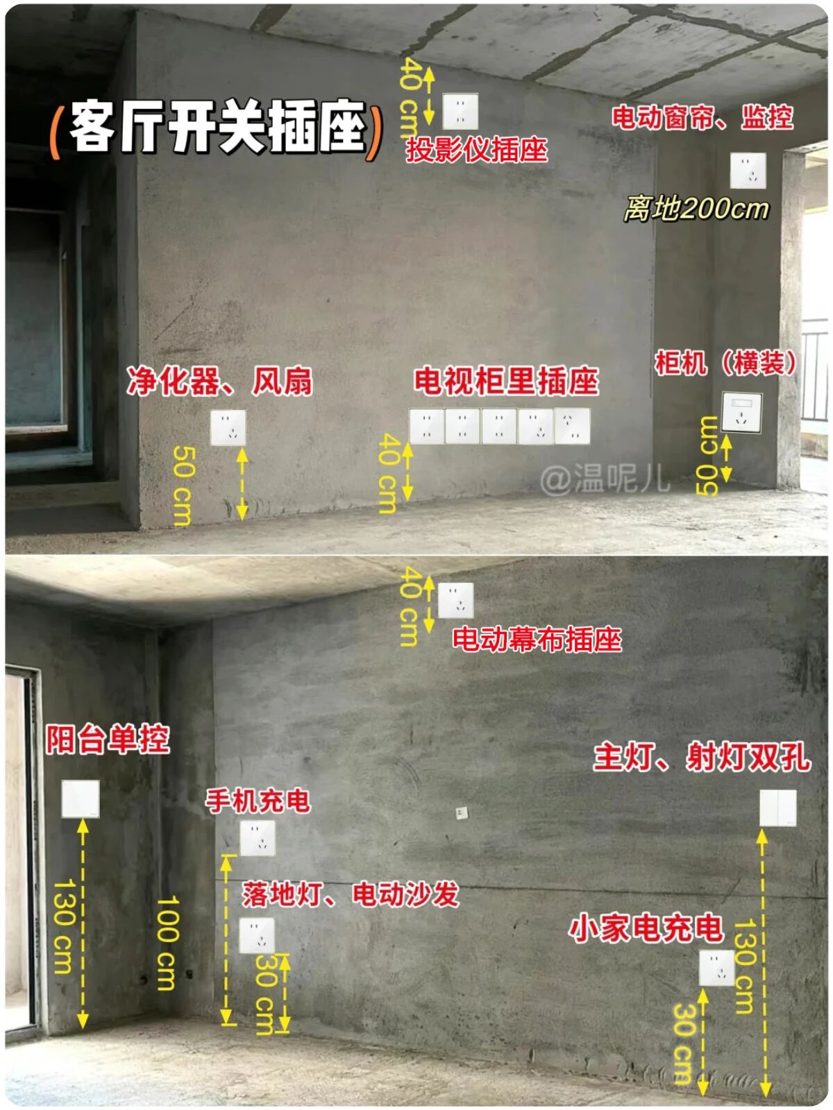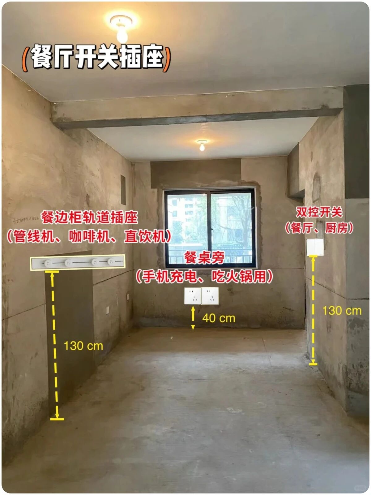 插座:桌下30-40cm处装2个插座(电磁炉火锅);台面上方1.2m处留3 个插座(咖啡机、烧水壶等);开关:厨房单控,餐厅的单控开关客厅区域