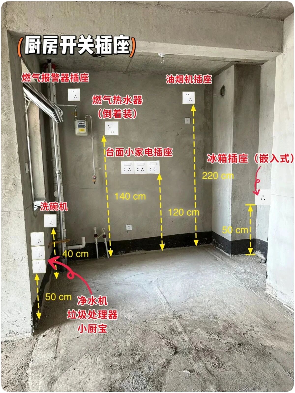 插座:台面4-5个(小电器),水槽下2个(净水器、垃圾处理器),油 烟机1个燃气热水器(离地1.8米),冰箱内嵌或顶部预留开关:吸顶灯单控卫生间区域