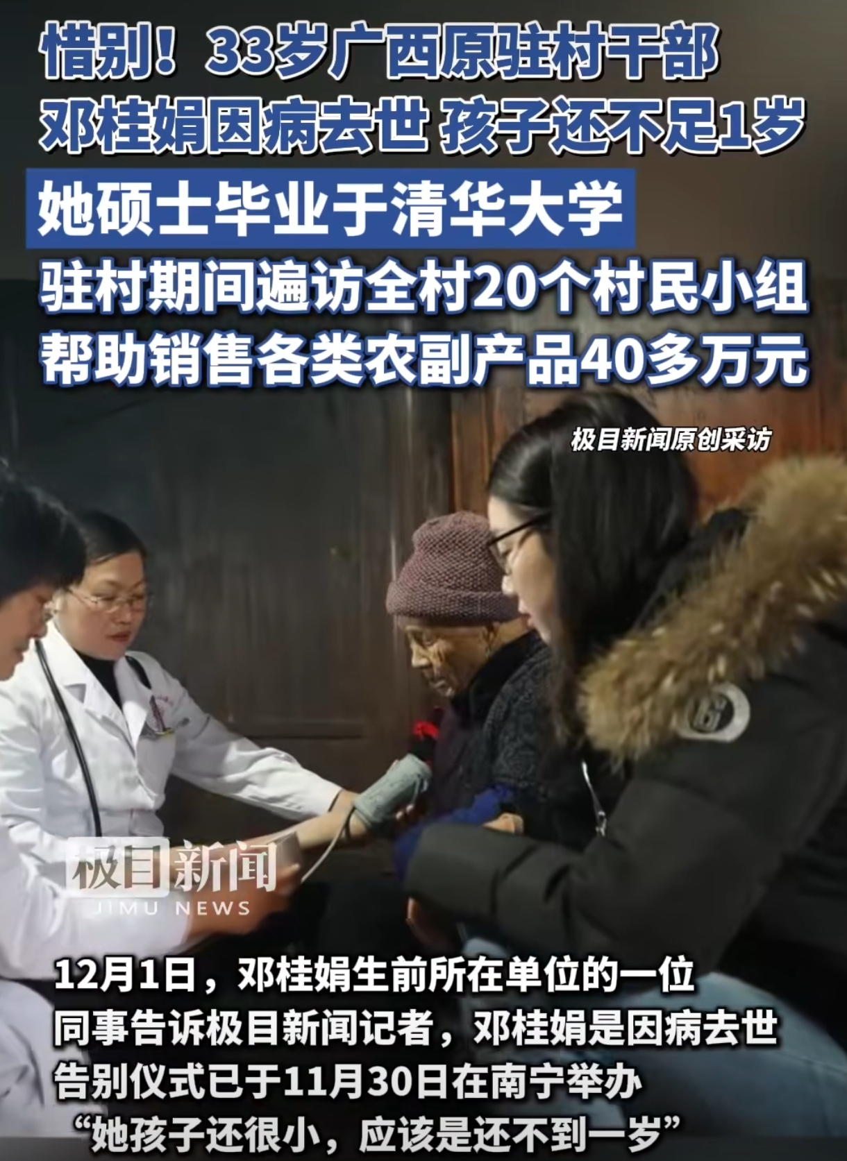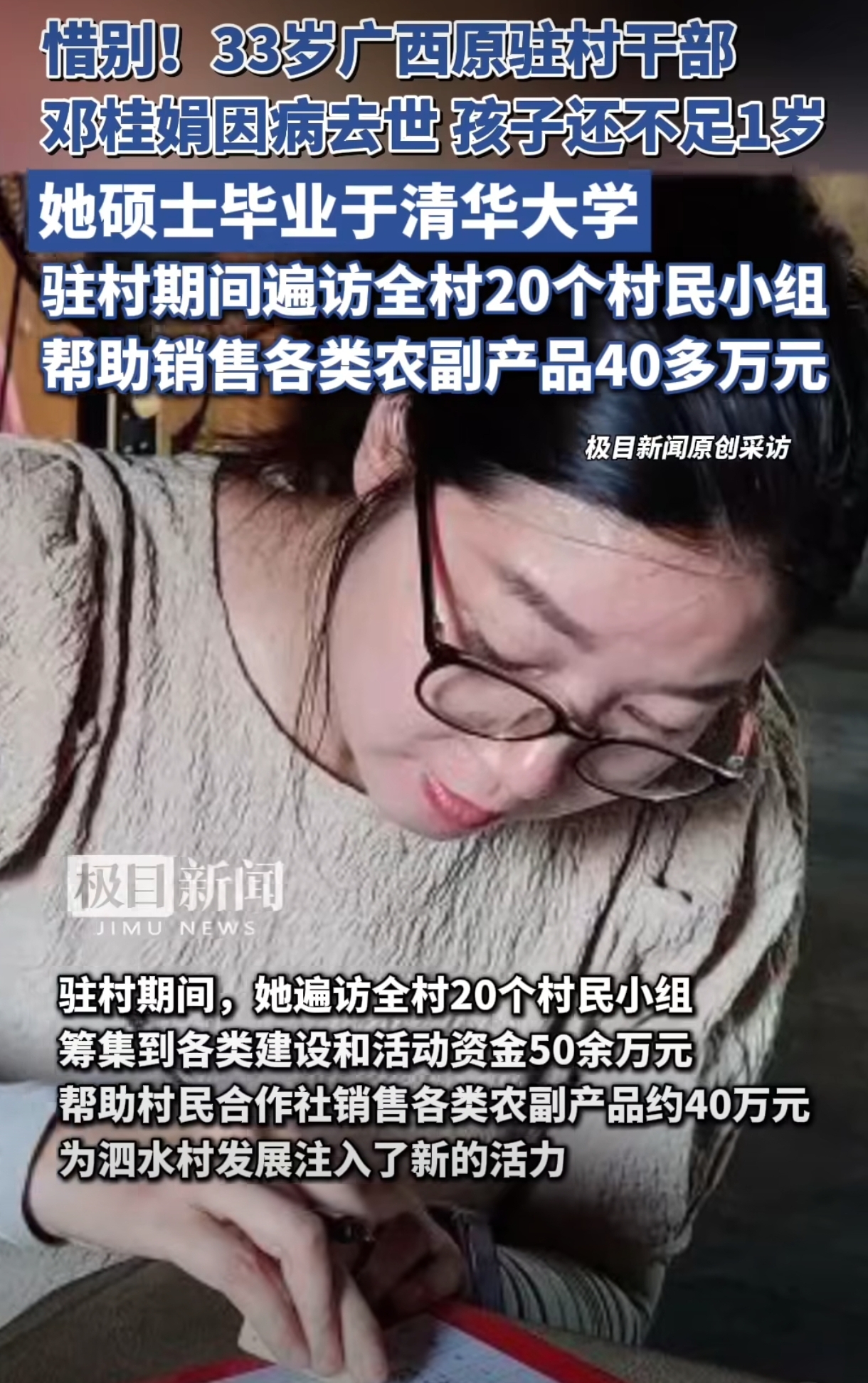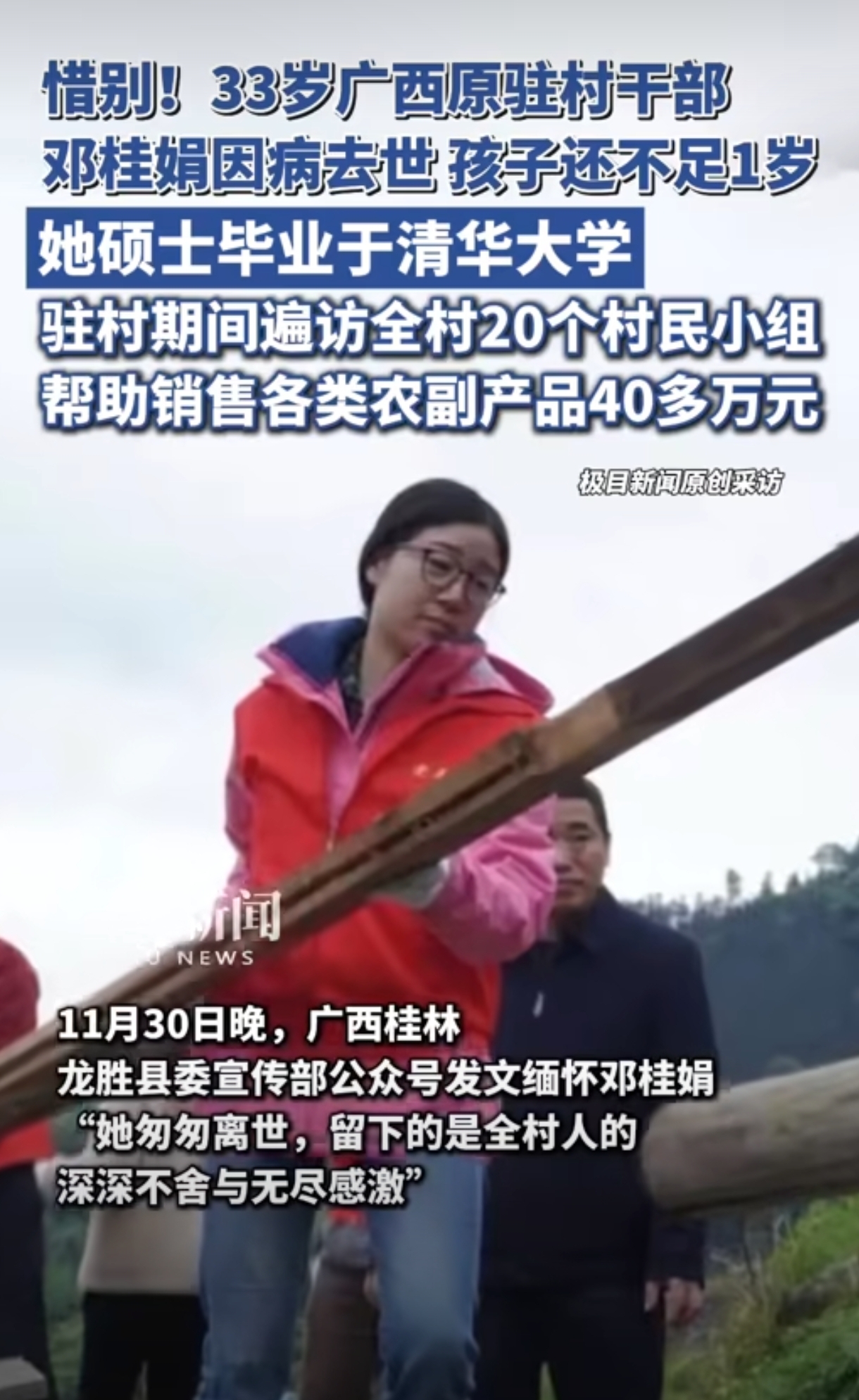 今天刷到一条新闻,心里咯噔一下。广西一个驻村女干部走了,33岁,叫邓桂娟。清华硕士,孩子还不到一岁。