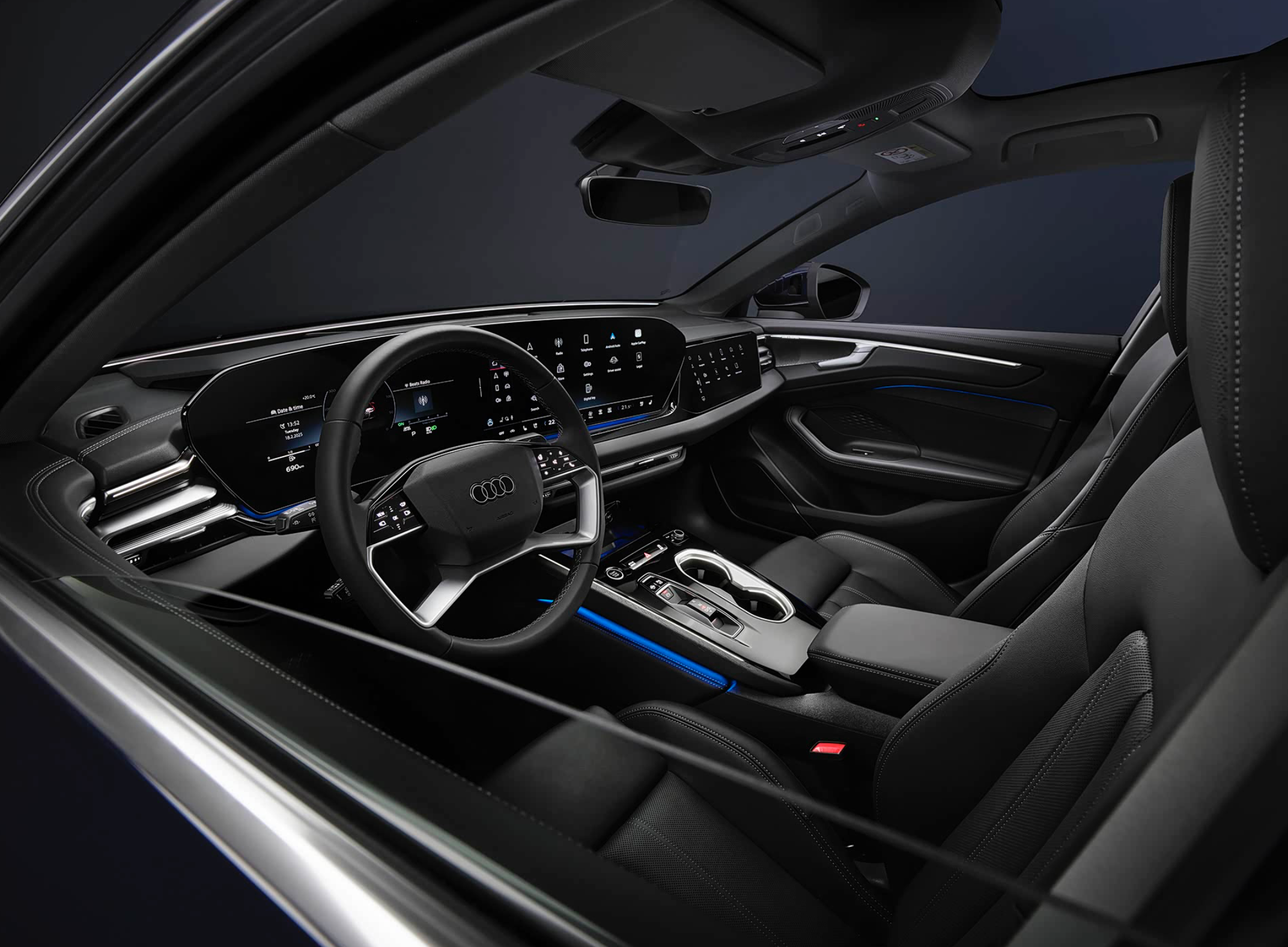 内饰方面,新一代奥迪A6L采用了大面积Nappa真皮材质,加入了精致的红色双缝线,还有大量银色金属饰条,车内提供黑色、黑色/米色、黑色/棕色和黑色/赤陶红色四种配色选择。中控台配备了11.9英寸的仪表+14.5英寸中控屏组成的曲面双联屏搭配13.1英寸HUD以及10.9英寸副驾娱乐屏,提供CarPlay手机互联和前排手机无线充电。提供了华为乾崑智驾的版本(有望作为选装配置),采用双激光雷达和视觉融合感知方案。车内配备了真皮沙发座椅,前排座椅通风、加热和按摩,后排还加入了老板键,还提供了头枕音响和Bang&Olufsen高级音响系统。车内还提供了多种颜色的氛围灯。主打低调、奢华。