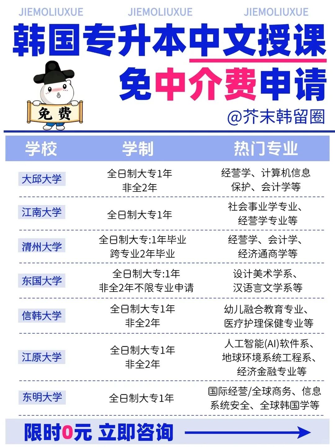 你是不是专科毕业想提升学历,又怕中介费坑几千块、语言不通学不下去?说实话,这波韩国专升本的羊毛得薅——全程中文授课就算了,现在还能免中介费申请,最快1年就能拿本科学历!
