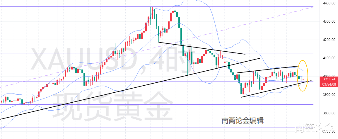上方呢,更有意思的是,小时图和四小时图的布林带几乎形成共振。虽说我们不看太多的辅助指标,但是这个在近期的帮助还算是不错的。目前中轨出与4000关口,可以当作分水岭,上方阻力则关注3925—38的得失即可。