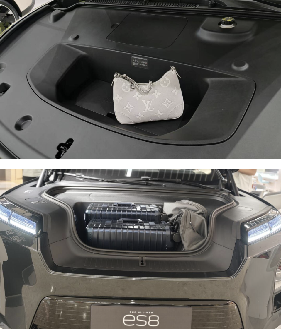 之前老婆的电车,前备箱才100来升,真是“食之无味”——登机箱塞不进,零碎东西又犯不着专门开前备箱,久而久之就成了摆设。但ES8这230L不一样,国庆带爸妈、老婆孩子满员出行,它直接成了“第二后备厢”:两个20寸登机箱(我和老婆的)+孩子的小行李箱,稳稳塞进前备箱,后备厢还能放下婴儿车、露营帐篷和折叠桌椅,再也不用跟爸妈抢行李空间。