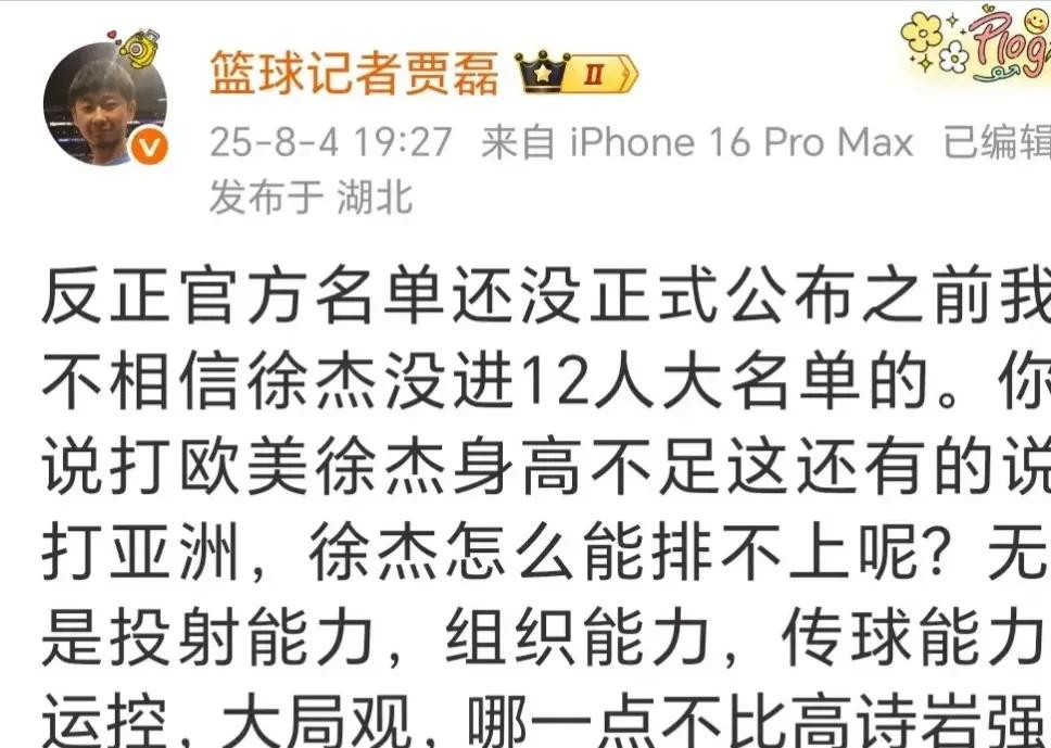 北京篮球记者贾磊更是毫不客气表示:打亚洲球队,徐杰怎么会排不上呢?不管是投射能力、组织能力、传球能力、运控能力还是大局观,哪一点不比高诗岩强?