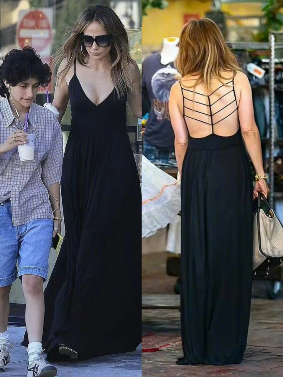 就在前几天,詹妮弗·洛佩兹 (Jennifer Lopez) 身穿黑色吊带长裙带着16 岁的女儿出门购物,黑色V领吊带裙尽显身材曲线,背部得设计也是大胆又张扬!脚踩凉鞋,佩戴金色圆形耳环,颇有明星范儿!