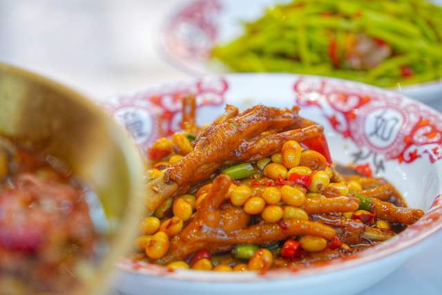 黄豆焖鸡爪很注重火候。鸡爪焖到指甲将脱未脱,黄豆煨得皮皱芯软,夹起一只晃悠的鸡爪,嗦进口中轻轻一抿,皮肉便像云朵般化开,只剩脆骨在舌面上打转。