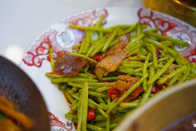 藜蒿炒腊肉。这道江西春天的"野菜爱马仕",只用藜蒿顶端三寸嫩茎,腊肉肥瘦相间蒸透再炒。脆嫩的藜蒿带着水泽气息,配上腊肉,油脂香与蒿香在口腔里交织。