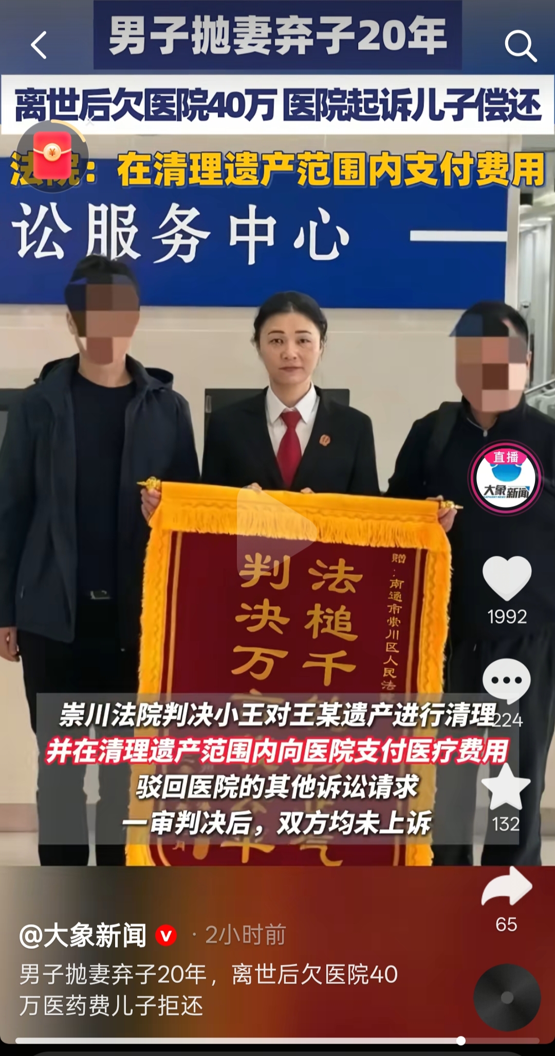 但网友们却吵翻了天,支持小王的人占了大多数:“20年不管不顾,父子情分早就断了,凭什么让儿子买单?”“父债子偿那是老黄历了,现在法律都讲独立民事主体,他爹的债该自己还!”“医院应该找债务人本人,找不到就起诉一个没享受过父爱、没继承遗产的儿子,实在让人难以理解!”