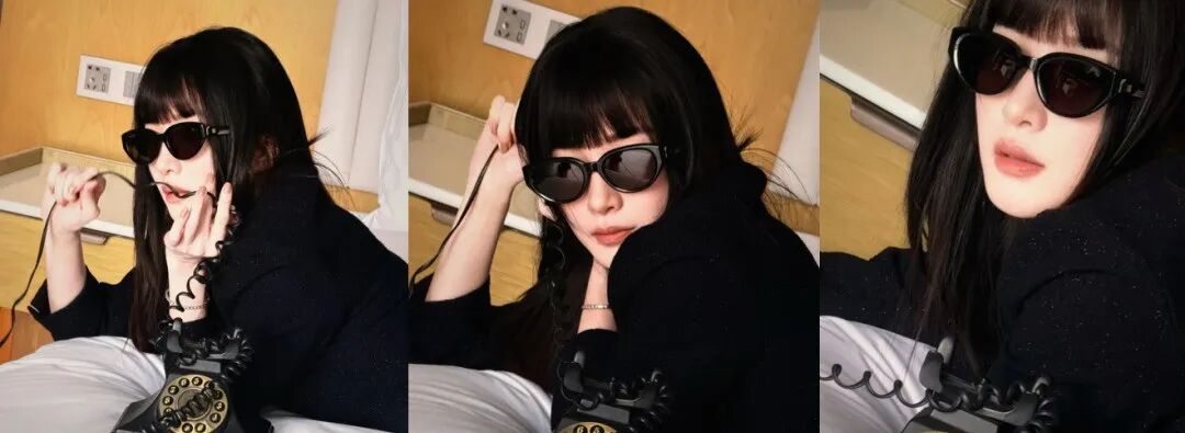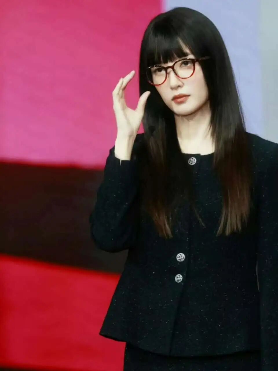 然而这次的造型选择却处处与她的特质相悖:厚重的齐刘海遮住了她最具表现力的眉眼区域,贴头皮的黑长直发让头型显得局促,oversized的黑框眼镜更是将她面部的优势完全掩盖。