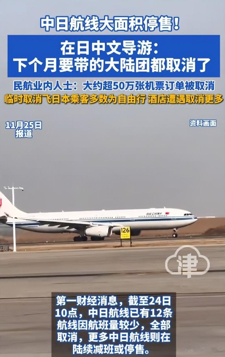 现在的局面,完全是日本政府一手作出来的死局,那一千多个亿的潜在损失,那172家因为水产禁令濒临破产的企业,那些被取消的航班——从国航上海到大阪的减班,到东航北京航线的腰斩,再到天津飞关西那惊人的65%取消率,这每一个数据都是打在日本脸上的响亮耳光。
