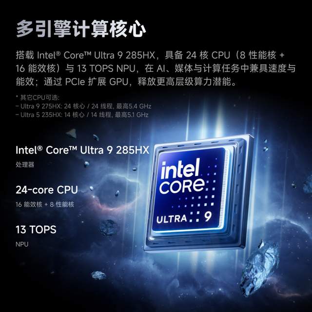 MS-02 Ultra最高搭载Intel® Core™ Ultra 9 285HX处理器,具备24核心、24线程,最高睿频达5.4GHz,支持100W持续高性能输出,多核性能较前代产品提升高达117%。配合13 TOPS NPU,在AI、多媒体、性能释放与能效优化方面都更出色。