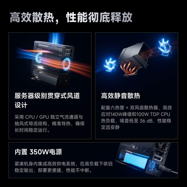 为保障持续高性能输出,MS-02 Ultra内置350W电源,并采用定制化六热管双风扇散热系统与贯穿式风道设计,即便CPU持续满载也能稳定控温,整机运行噪音控制在待机36dBA、满载46dBA。