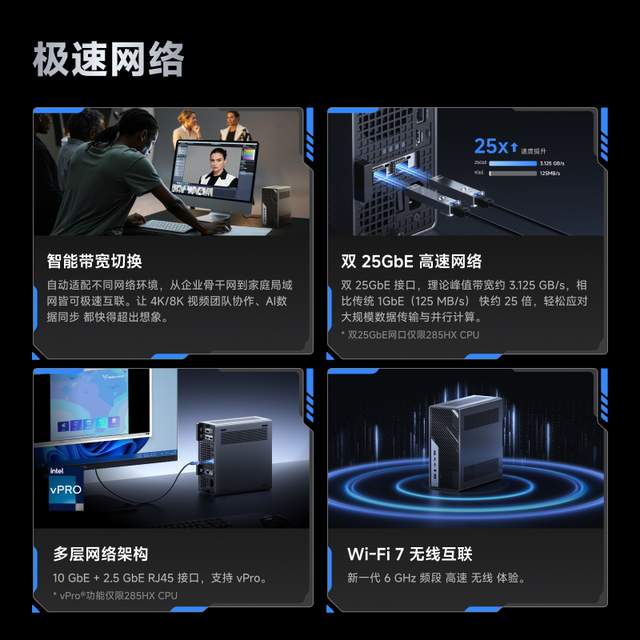 网络配置同样旗舰,搭载双25GbE SFP+网口、一个10GbE与一个2.5GbE接口,并集成Intel vPro远程管理技术,支持“无电源远程系统重装”。前部配备双USB4 v2接口,带宽高达80Gbps,可实现外置阵列与采集卡直连。