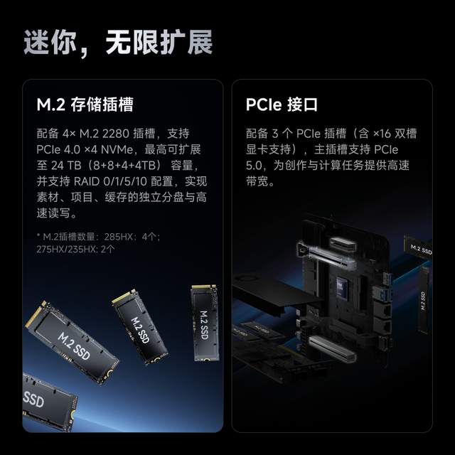 存储方面,MS-02 Ultra集成4个M.2 PCIe 4.0 x4插槽,最高可实现24TB高速固态存储,轻松应对8K视频项目及大型工程文件的并行读写。