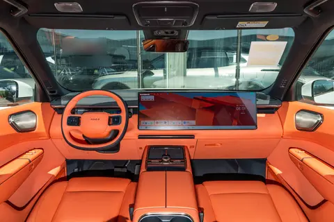 内饰坐进车内的一瞬间,内饰的质感和设计就开始影响我们的驾乘感受。深蓝S09和领克900都采用时下流行的一体式大屏布局,中控台和门板均使用大面积软性皮质包裹,触感柔软舒适。但在具体细节上,两款车型各有特色。深蓝S09采用三幅式方向盘设计,握感舒适,配合磨砂银中岛装饰,整体呈现出简约大气的风格。车内视觉核心是由两块15.6英寸悬浮式屏幕组成的连体大幕,副驾的妻子可以轻松操作导航或追剧,完全不会干扰我的注意力。最让孩子们开心的是后排21.4英寸的3K吸顶屏,通过鸿蒙座舱HarmonySpace5系统,可以实现多屏联动,解决长途旅行时家人的不同娱乐需求。同时还有43英寸AR-HUD抬头显示,能将导航、行车等关键信息投射于前风挡,营造出非常开阔的前排视野。