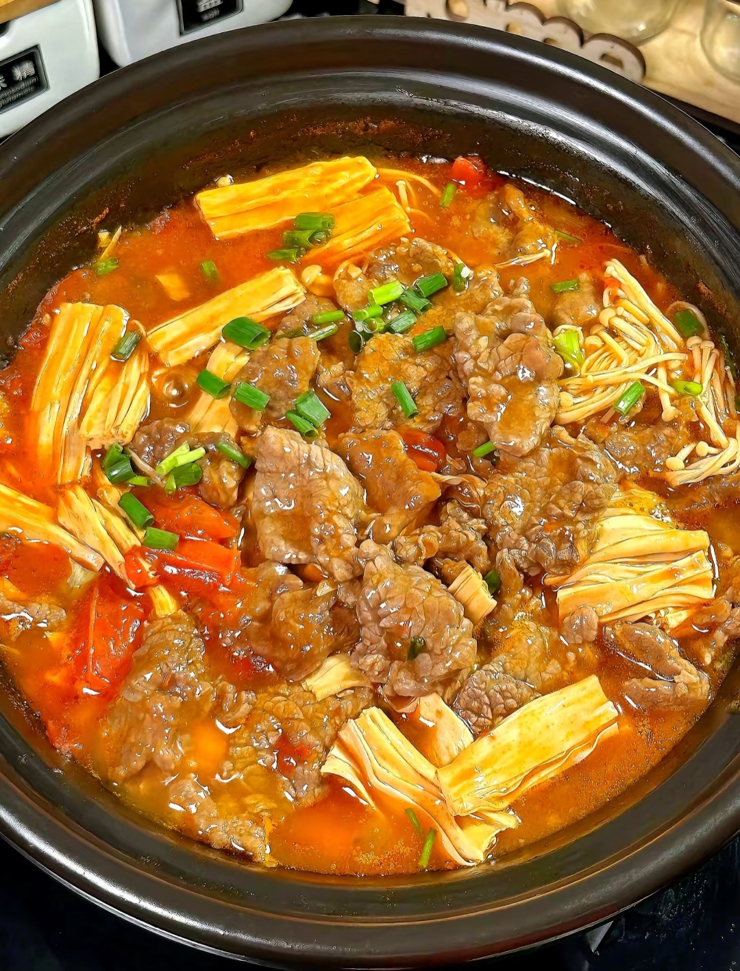 这道番茄腐竹牛肉煲,像一本写满注脚的食谱。它教会我们:真正的好菜不需要复杂工序,当番茄的酸遇见牛肉的醇,当腐竹吸饱了时光的味道,最平凡的食材也能炖煮出让人眼眶发热的温柔。此刻砂锅还在冒热气,你要不要也盛一碗?