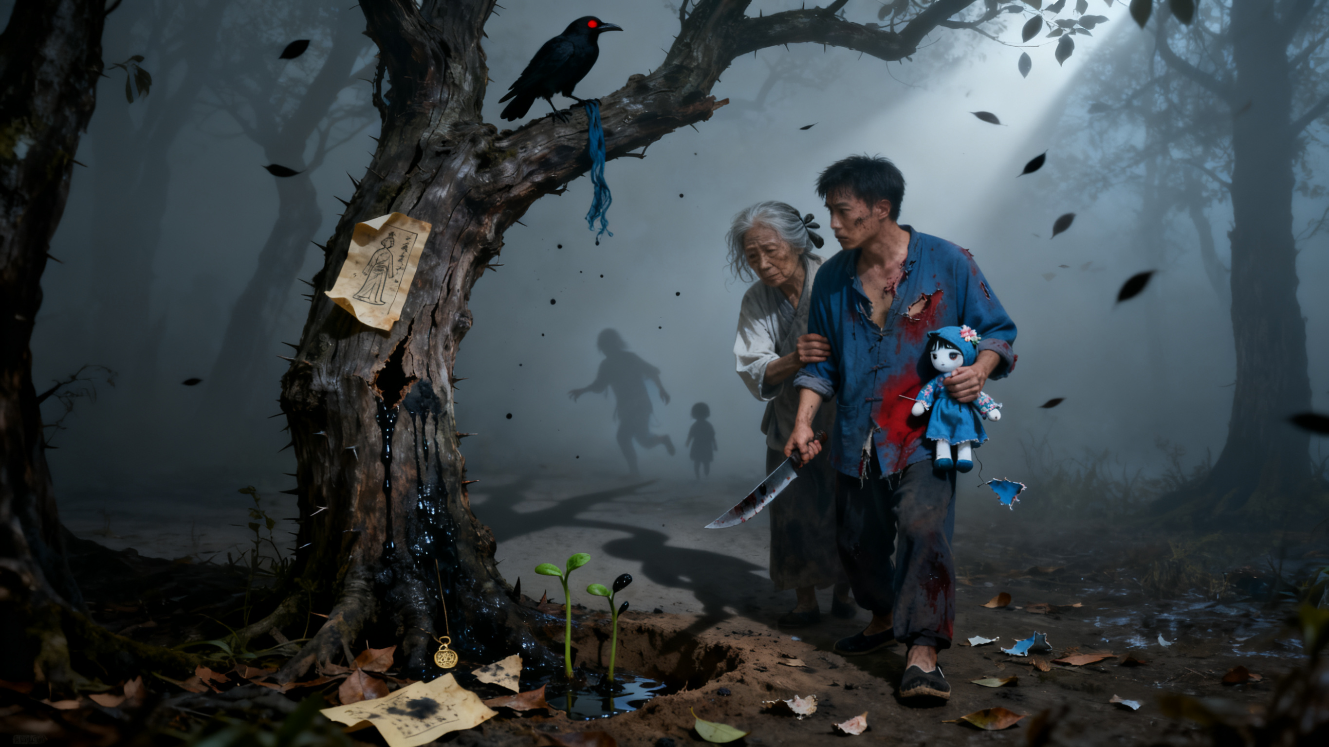 突然,周围的树全晃了起来,树干上的裂口 “咔嚓” 张大,掉出些头发丝和碎布片 —— 那些碎布片,有的是蓝布,有的是灰布,像是从不同人的衣服上撕下来的。更吓人的是,树叶像针一样往下落,扎在我的脖子上,又疼又痒。我伸手一摸,树叶竟化成了黑汁,顺着我的皮肤往肉里渗,凉得像冰。