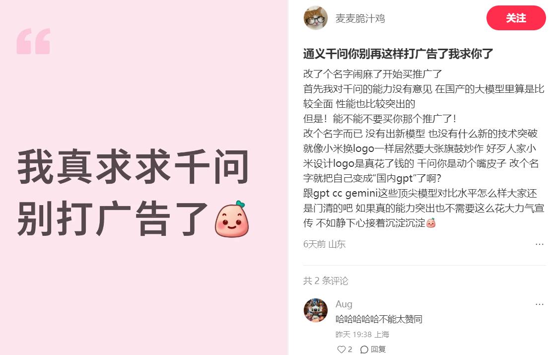 值得一提的是对于千问立体式的宣传方式,值接Talk发现已经引起了部分网友的反感。