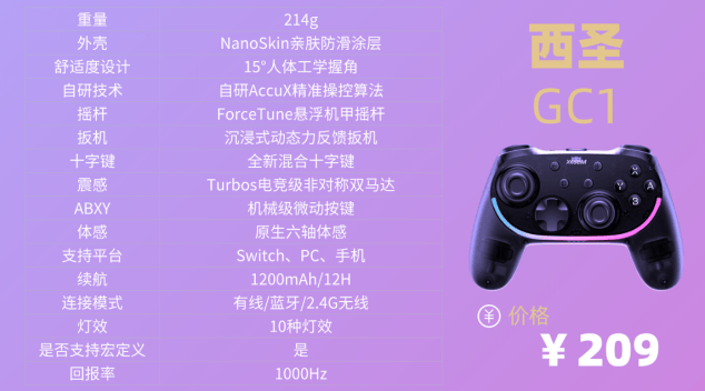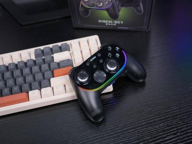 西圣GC1搭载电竞级极速连接引擎,延迟低至0.5ms,支持2.4G、蓝牙及Type-C三模连接,操作几乎无感延迟。原生六轴体感传感器实现旋转、倾斜、挥动等动作的1ms级低延迟精准映射,沉浸式操控体验一触即发。手柄轻量化设计(214g)、握角科学(15°)、NanoSkin亲肤防滑涂层贴合手型,握持稳固舒适;半透明幻雾晶透机身配合RGB炫酷灯效与10种模式,科技质感满分。全平台兼容性极强,Switch、PC、手机均可轻松畅玩,让这款百元级手柄的整体配置和体验在同价位中几乎无敌。