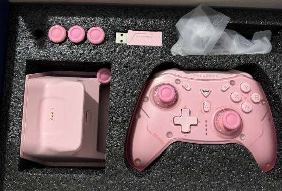 这款手柄采用的是Xbox的经典布局,握起来饱满但不笨重。随盒附带的RGB充电底座一亮,整套配置立刻有了电竞主机的感觉。底座下方还藏了一个小仓位,可以把2.4G接收器和备用的十字键帽直接塞进去,不用怕弄丢。机身的线条圆润,掌心贴合度高,长时间刷游戏不容易累。更重要的是,连接方式非常全:PC、Switch2、蓝牙、2.4G 都能直接用,APP 还能进一步调参数,无论放在哪个平台上都能马上进入状态。