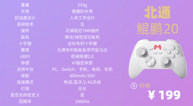 十字键换成新版本的转轴结构,方向触发更准;震动支持多级,还能根据游戏智能变化。三模连接(2.4G/蓝牙/有线)在不同设备之间切起来挺快,PC、Switch、手机等这些平台都能直接用。续航方面,单次可以使用20小时,对于日常使用来说是完全足够的。