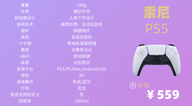 手柄外层用的是细腻的磨砂材质,握在手里既不打滑也不黏腻,长时间游戏下来手指和掌心都不会有疲劳感。按键和摇杆沿用了索尼经典布局,上手没有任何陌生感。自适应扳机和触觉反馈依旧是它最大的卖点——不同类型的游戏会给出完全不同的力道与震动表现,比如赛车中油门的回弹、射击中扣扳机的力度变化,都能清晰传递出来。有一点小小的不足在于,部分场景下扳机阻尼会显得偏紧,个别游戏的震动表现也稍微“用力过猛”,不过整体来说仍然是一种比较独特、也很有沉浸感的体验。