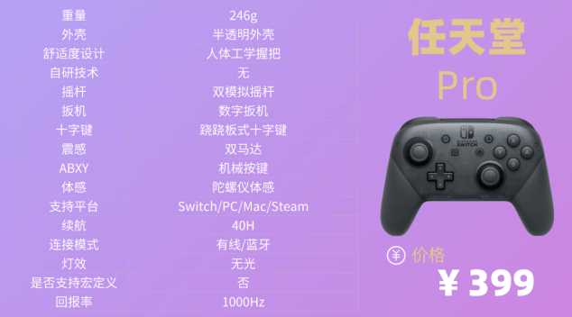 无线稳定性一直是Pro手柄的强项,在Switch上几乎没有延迟焦虑;连PC、Mac也都很顺畅,尤其是Steam游戏支持度非常高。续航一次性可以使用40小时,不用多说,属于能连玩好几天那种,加上充电方便,不太需要管理电量。