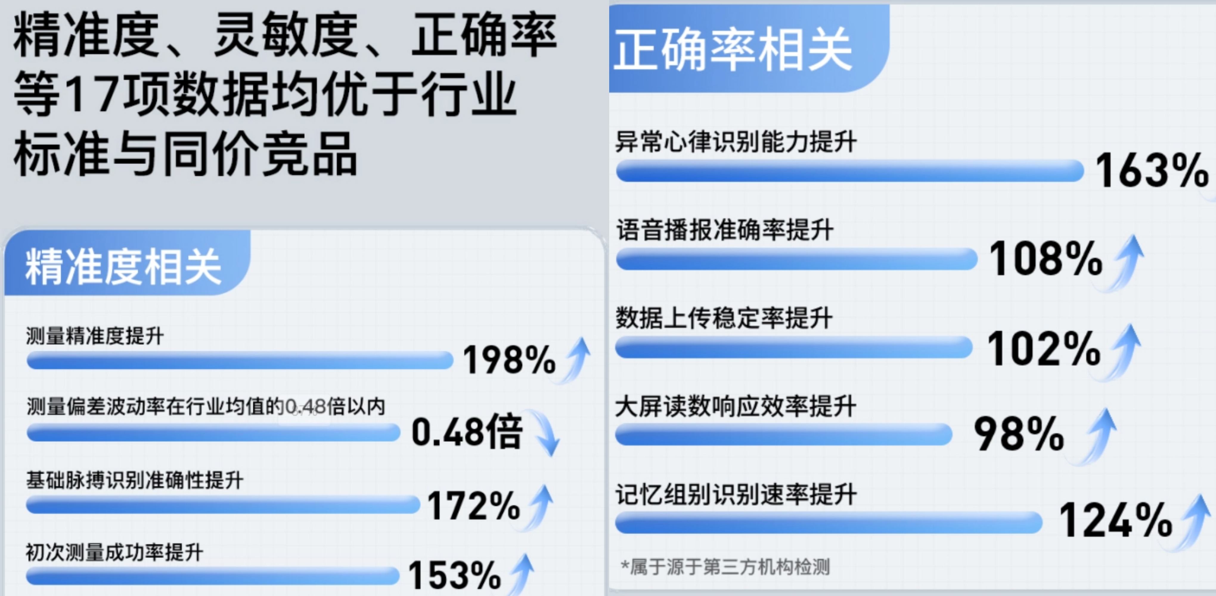 它采用自主研发的无距传感测压技术,将双滤波稳定算法、双通道SOC硬核芯片、自研三重校准算法、双循环检测传感器、增压过程与筒壁无距衔接。这是一种医用级准确测量技术,相较其他血压计测速更快,测量更准确,结果更准确,数据更稳定。对比报告显示灵敏度提升126%,准确度提升198%,稳定率提升102%,是测评过的产品里面最好的,效果足以媲美院线专业测压仪。