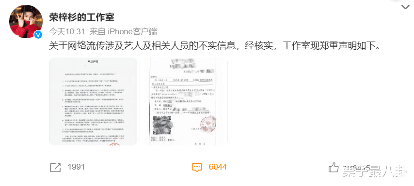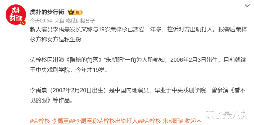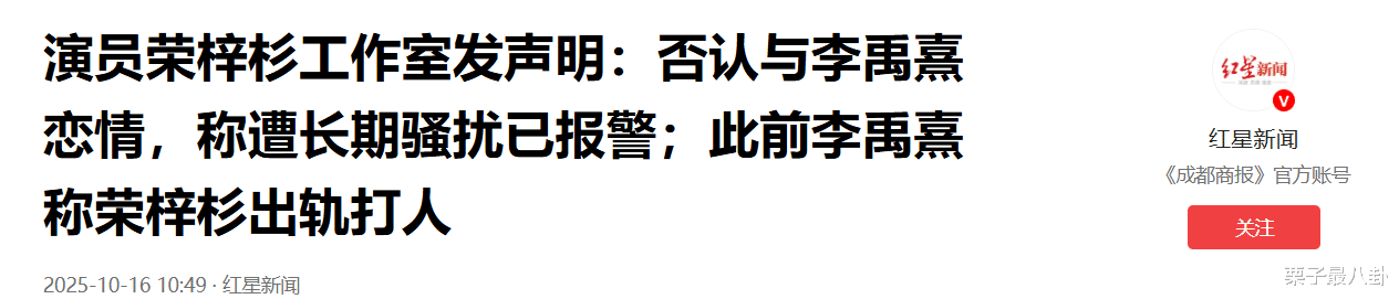 荣梓杉方否认恋情,称女方是私生10月16日的上午10点半,荣梓杉工作室发布了声明,表示荣梓杉从未和李禹熹建立过恋爱关系,更不存在出轨。