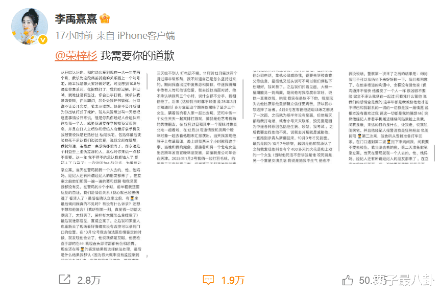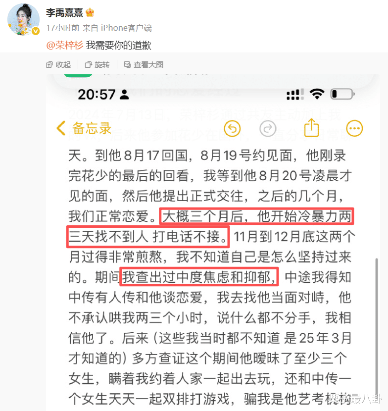 前女友发长文控诉10月15日,中戏出身的女演员李禹熹在微博发了5页文字控诉荣梓杉在恋爱期间不忠贞,脚踏多只船,甚至还对她施加暴力。
