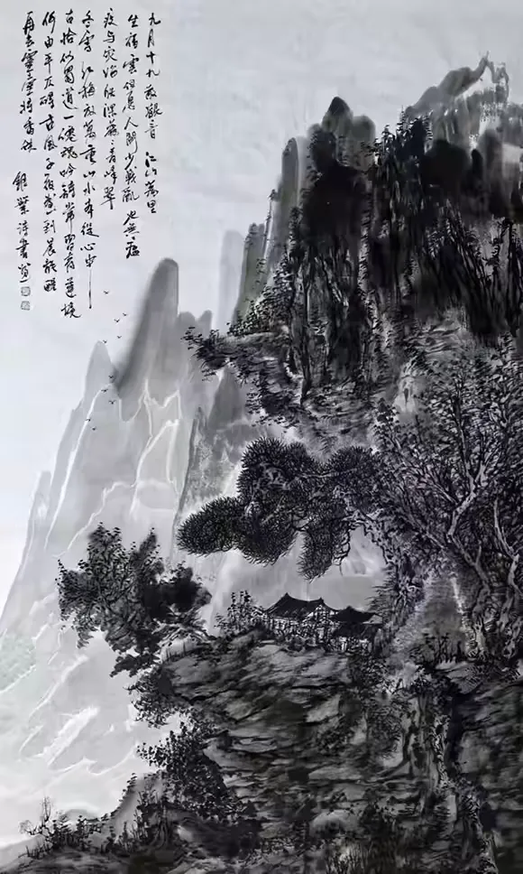 相较于传统水墨山水,他一方面保留了水墨本体的黑白灰基调,以墨分五色的层次变化表现山石的肌理与空间的深远;另一方面,又在部分作品中局部施以花青、赭石等矿物色,或通过淡彩晕染增强画面的光感与氛围,使传统山水画呈现出更具现代感的视觉张力。