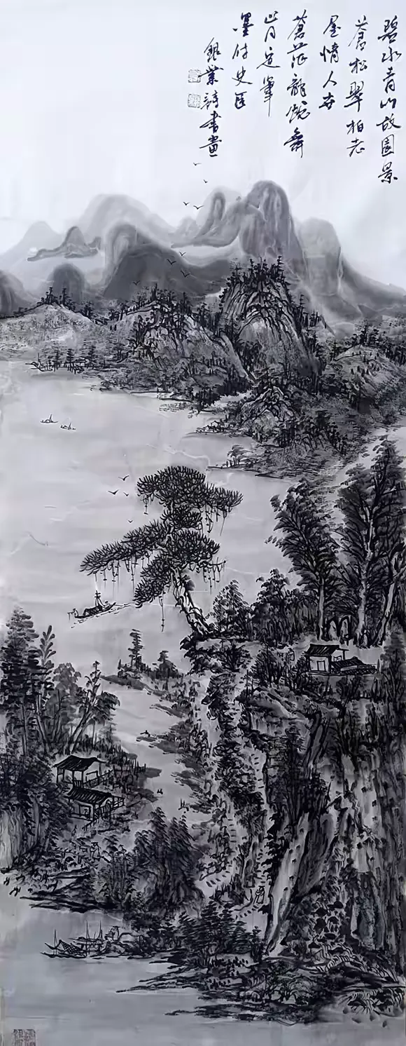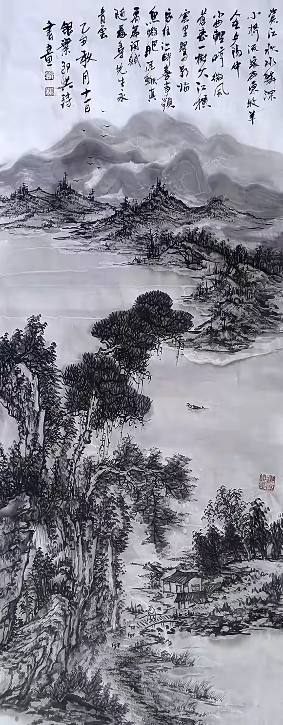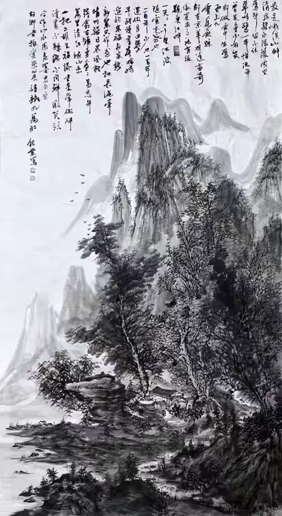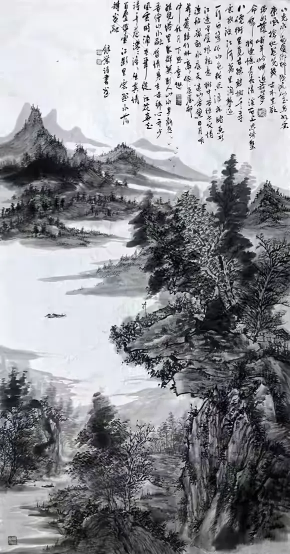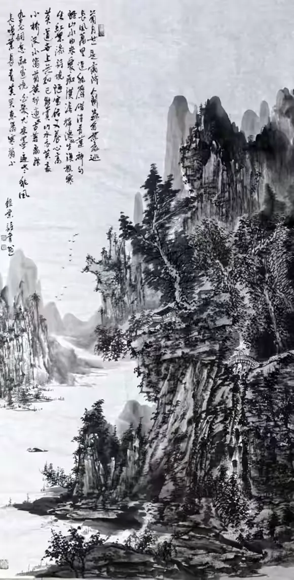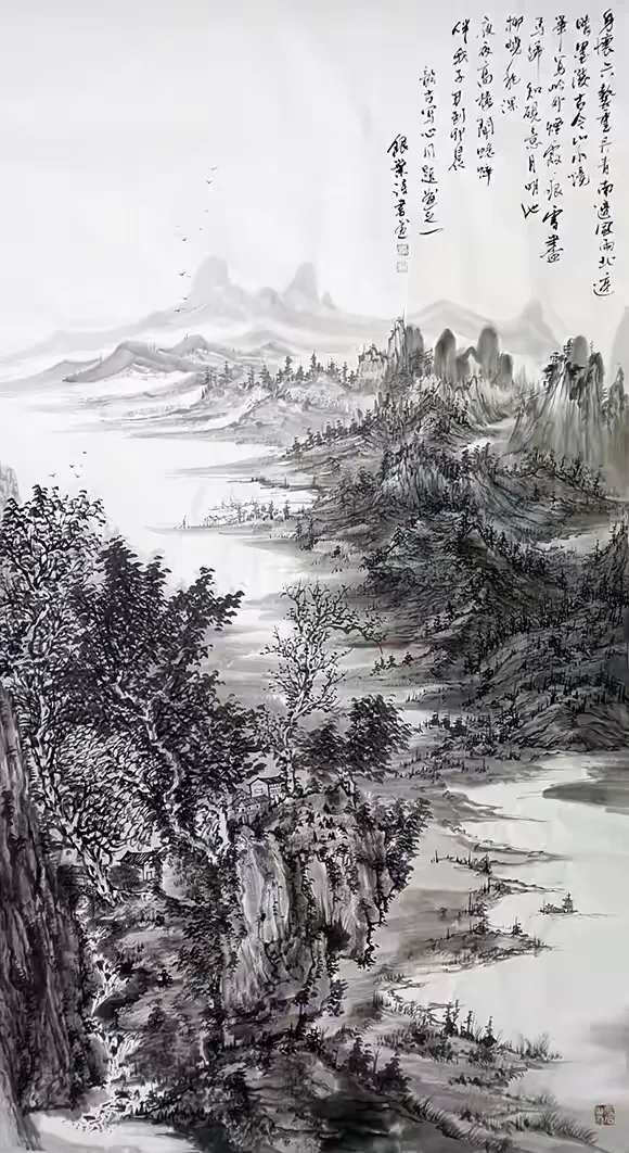 刘银叶先生作为当代杰出的文人画家与词赋家,其水墨山水作品超越了单纯的视觉呈现,构成了一个诗、书、画交融互通的完整艺术宇宙。他的画作,是其深厚文学修养与笔墨功底的集中外化,展现出一种独特的“词赋意境”与“书写性笔墨”高度统一的艺术风貌。