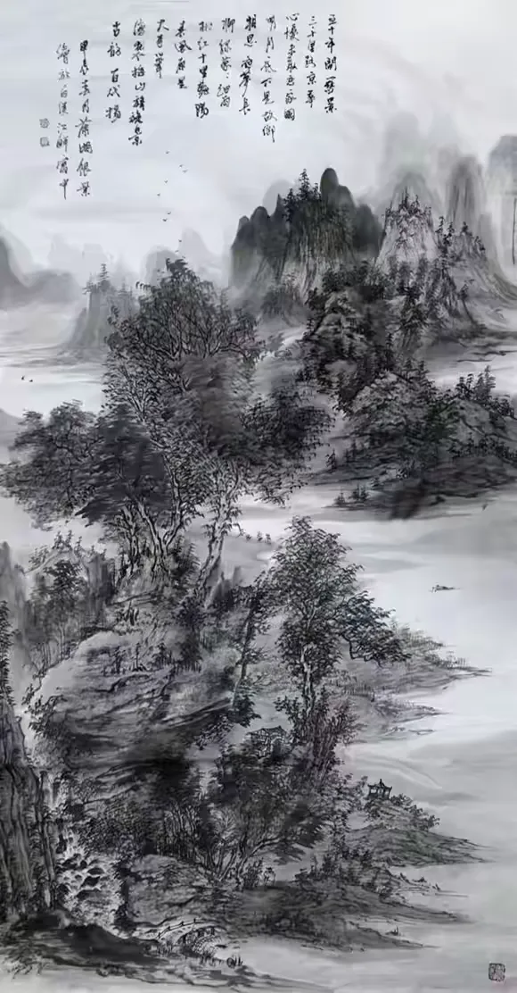 在继承传统的同时,他大胆突破程式化技法,尝试将西方绘画的光影效果、空间透视与东方水墨的写意精神相结合。例如,他常以积墨法营造山峦的厚重感,又以泼墨、破墨等技法表现云水烟霞的氤氲,形成“浑厚中见空灵”的视觉效果。