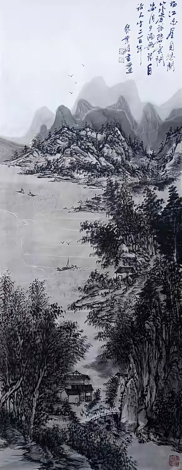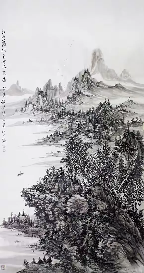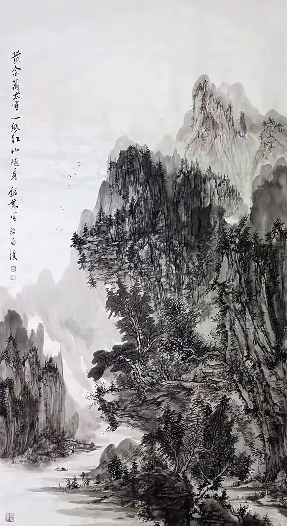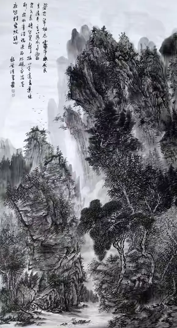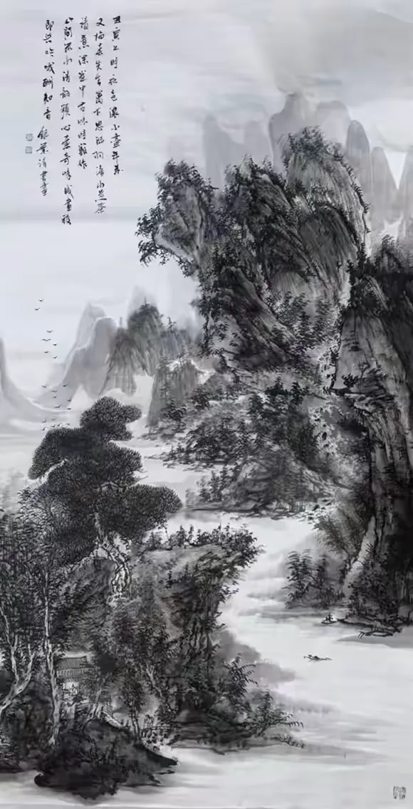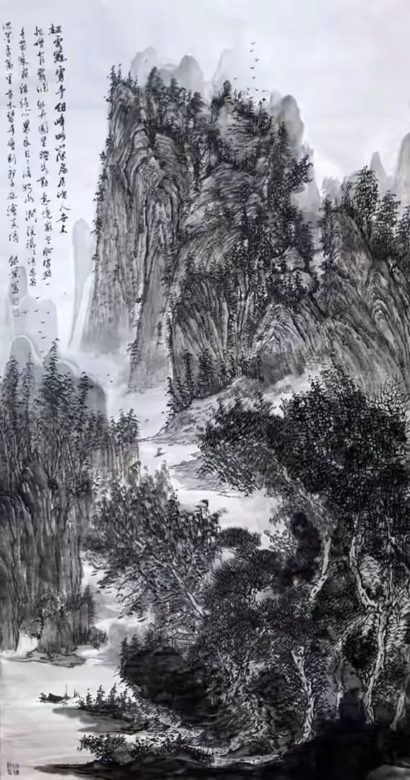 此外,他的作品常流露出禅意与诗性,通过留白与墨色的对比,营造出“空山无人,水流花开”的静谧意境。这种意境既源于道家“虚静”的审美追求,亦与画家个人对自然与生命的哲思密切相关。