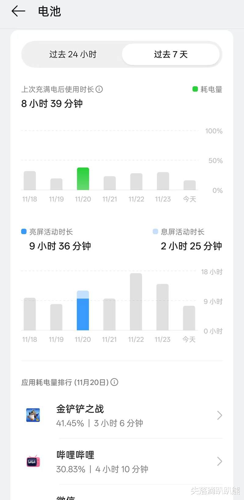 查看电量使用记录,系统记录了我11月20日最高一天亮屏九个半小时耗电也不到50%,这续航表现可以说是非常夸张了。